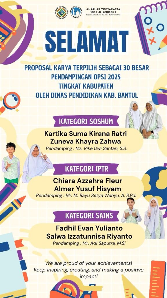 Selamat kepada para murid hebat SMP Islam Al Azhar 66 Bantul yang proposal penelitiannya terpilih untuk mengikuti pendampingan khusus dari Dinas Pendidikan Kabupaten Bantul dalam rangka menuju seleksi Olimpiade Penelitian Siswa Indonesia (OPSI) 2025.